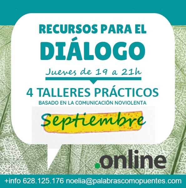 Hoy cerramos el mes de agosto y ya siento como el verano marcha. Entra aire fresquito por el balcón ahora mismo y me acompaña esa sensación de que viene la renovación, pasamos a otro ciclo, dejamos atrás ciertas cosas y emprendemos o reemprendemos otras. Yo por mi parte, con alegría y muchas ganas de aprender juntxs, abro una nueva serie de 4 talleres prácticos basados en la Comunicación NoViolenta. Durante este verano he seguido trabajando en traducciones sobre CNV y, también, paso a paso, avanzando con mi proyecto Palabras como puentes, cómic de introducción a la CNV. Siempre es poco el tiempo del que dispongo para que cunda como me gustaría, pero espero poder mostrarnos algunos avances pronto por aquí. Para más información sobre los talleres, puedes contactar conmigo por el medio que te vaya mejor.